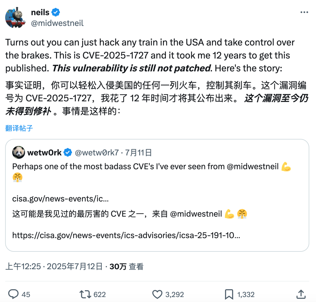 要知道,這個問題在美鐵路系統已經潛伏几十年了,發現它的安全研究員 Neil Smith 為了讓漏洞被修復,跟鐵路巨頭博弈了 12 年。