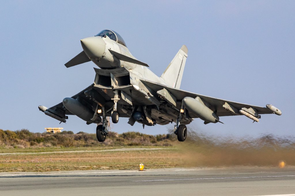一架攜帶ASRAAM和“流星”空對空導彈的英國皇家空軍“颱風”戰鬥機從塞浦路斯阿克羅蒂裏皇家空軍基地起飛。英國王室版權所有