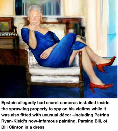 在檢方對愛潑斯坦的起訴書中指控,該攝像頭系統被用於錄製視頻,目的是為了敲詐。該房產還配備了不尋常的裝飾,包括克林頓總統身着藍色連衣裙腳穿紅色高跟鞋的油畫“解析比爾”。