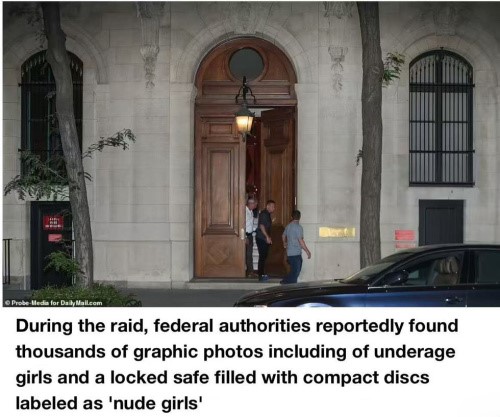 據《每日郵報》報道,聯邦當局在搜查愛潑斯坦的別墅時,發現了數千張包括未成年女孩在內的色情照片,以及一個上鎖的保險箱,裏面裝滿了標有“裸女”字樣的光盤。