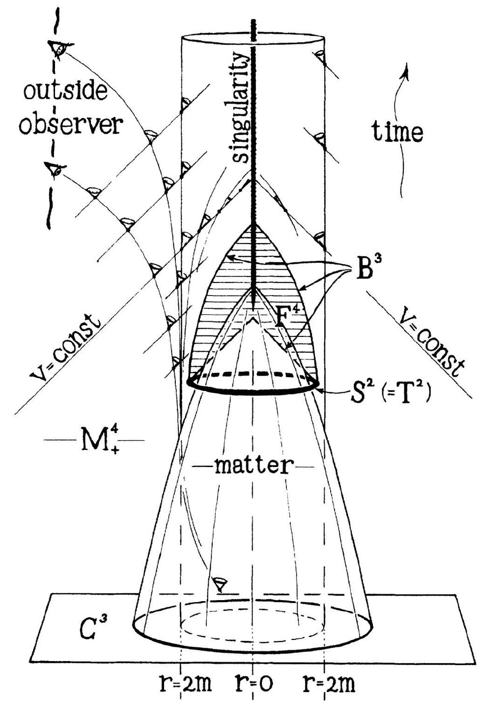 彭羅斯1965年論文中的手繪圖解(被譽作"愛因斯坦之後廣義相對論領域中最重要的論文"),生動展現了時空坍縮形成奇點的過程。