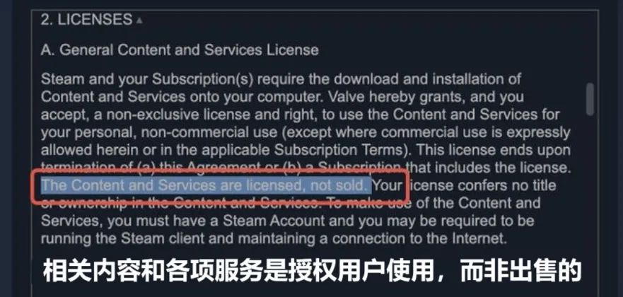 V社面對玩家的質疑,絲毫不慫,直接指出用户協議明確規定,Steam相關賬號和其中的遊戲(遊玩權限)不可轉讓,哪怕玩家明確在遺囑中寫有“我將賬號贈送給XXX”,Steam也無法為這個人提供合法的訪問權限,更不能將逝世的玩家遊戲庫內容與另一個指定賬號合併。