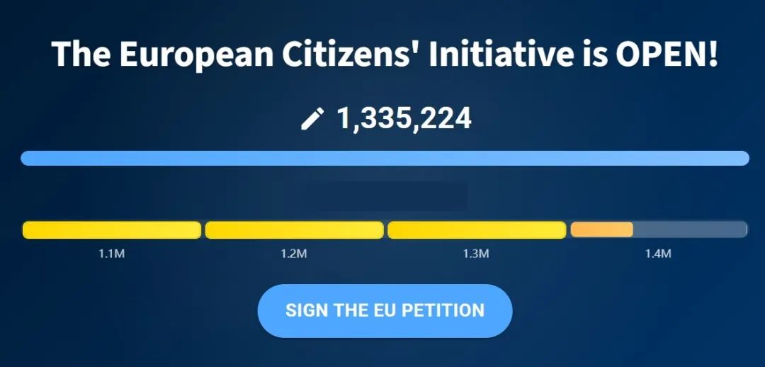 最終,“停止殺死遊戲”運動在請願截止日期前,湊夠了100萬人,達到了歐盟委員會討論的標準,目前更是漲到130萬,標誌着這場大起義迎來了階段性勝利。