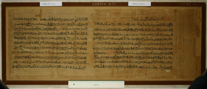 例如著名的哈里斯大紙草(Great Harris Papyrus),公元前1164年拉美西斯四世統治初期繪製,距今3000多年。1835當地人在底比斯(現在叫盧克索)近郊懸崖墓的地板洞中發現,1855年英國駐埃及領事哈里斯從阿拉伯古董商收購,1872年大英博物館購入。全長41 米之多,由79張莎草紙粘接。