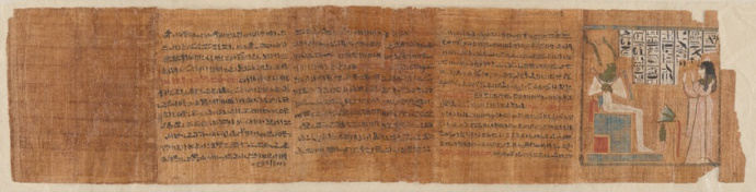 圖四是另一個例子,約公元前1000年的Tayuhenutmut的葬禮莎草紙,現存芝加哥藝術館,圖中頁數更多,還有畫。哈里斯大紙草也是非常多畫,多種顏色。