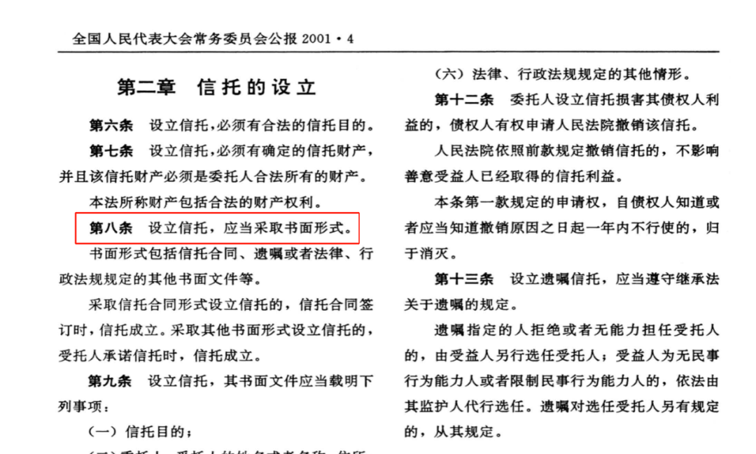 首先,這筆信託計劃只有口頭承諾,沒有書面文件。這也是宗馥莉團隊祭出的法律武器——援引《信託法》第8條“設立信託必須採取書面形式”,質疑原告未能提供宗慶後簽署的信託契約。