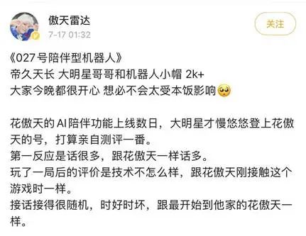 於是最終,“明星人設”賦予了其天然的話題性,長期記憶又使其獲得獨一無二的成長經歷。越來越多玩家積極在社交平台上曬出自己與“花傲天”的交往日常。不僅是AI本身填補了玩家的社交缺口,連相關話題都成為玩家之間新的社交貨幣。