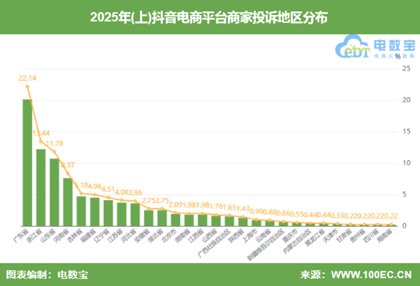 上半年,投訴抖音電商平台的商家註冊地區TOP10依次為廣東省(22.14%)、浙江省(13.44%)、山東省(11.78%)、河南省(8.37%)、吉林省(5.18%)、福建省(4.96%)、遼寧省(4.52%)、江蘇省(4.08%)、河北省(3.97%)、安徽省(2.75%)。