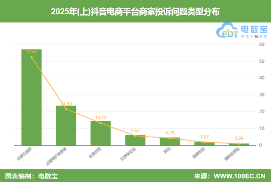 據“電訴寶”顯示,2025年(上)抖音電商平台涉及近2000份商家投訴,問題類型主要集中在這六項,其中任意僅退款佔比最高,為52.42%;其餘問題類型依次為:過度維護消費者(21.59%)、任意罰款(13.22%)、扣押保證金(5.62%)、隨意封店(1.87%)、強制運費險(0.99%)。
