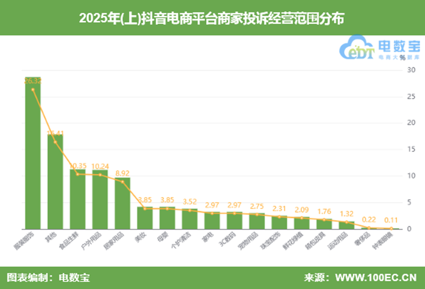 上半年,投訴抖音電商平台的商家經營類目TOP5依次為服裝服飾(26.32%)、食品生鮮(10.35%)、户外用品(10.24%)、居家用品(8.92%)、美妝(3.86%)。