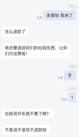 退款成功後,買家還聯繫賣家,辱罵嘲諷併發送“僅退款”成功截圖。賣家表示,已就此次不合理“僅退款”判斷權益受損,現訴求買家進行賠償並道歉,且不接受任何調解。