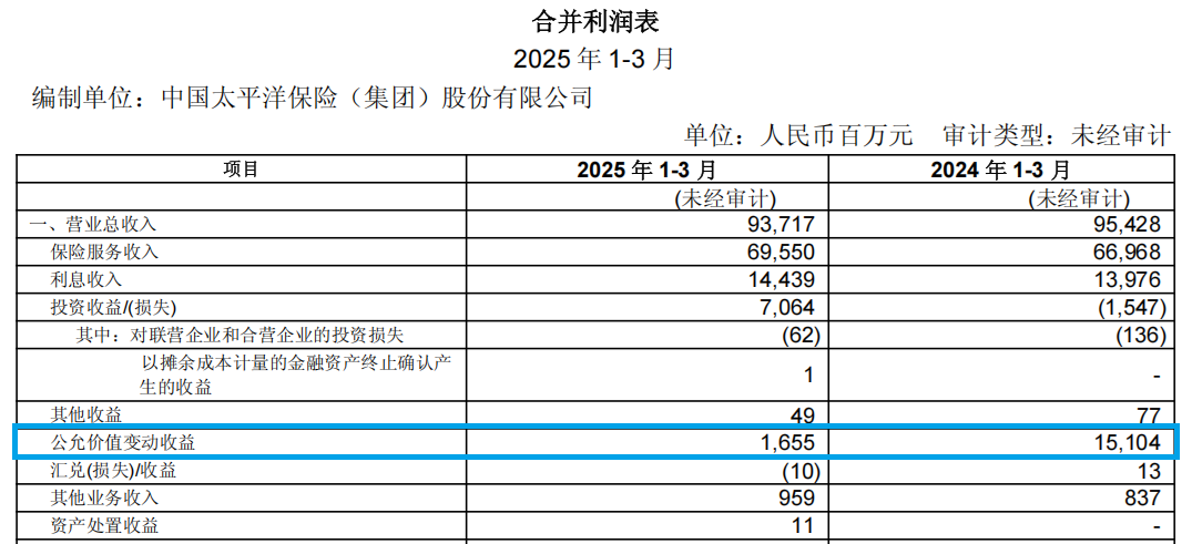 但資本市場從不是慈善家。2025年一季度,隨着債市、股市回調,中國太保的總投資收益率為1.0%,同比下降0.3個百分點;公允價值變動收益從2024年同期的151.04億元跌至16.55億元,淨利潤隨之應聲下滑。