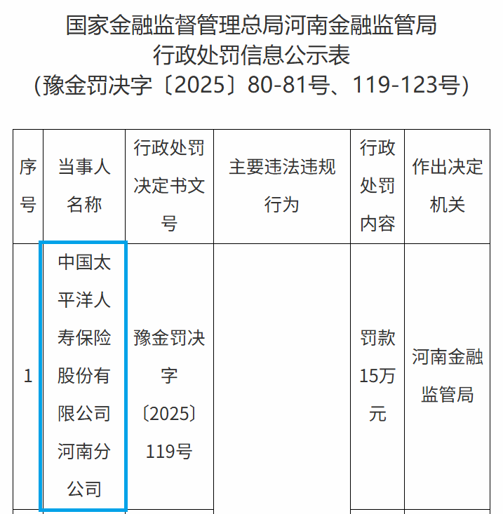 同樣,太平洋壽險分支機構的違法違規行為也頻頻出現。2025年1月,上海分公司因“虛構經濟事項套取費用”被罰款19萬元;廣西分公司因“跨區域經營保險業務、對投保人隱瞞與保險合同有關的重要情況”被罰款28萬元;5月,江西分公司因“未如實記錄保險業務事項;給予投保人、被保險人、受益人保險合同約定以外的利益”被罰款43萬元。