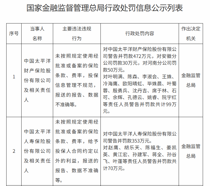 根據通報,太平洋產險因“未按照規定使用經批准或備案的保險條款、費率,投保信息管理不規範,報送的報告、數據不準確”等問題被罰472萬元,同時安徽、河南兩家分公司分別被追加罰款30萬元、50萬元,葉某滿等責任人合計被罰99萬元;太平洋壽險則因“未按照規定使用經批准或備案的保險條款、費率,給予投保人合同約定以外的利益,報送的報告、數據不準確”等問題被罰353萬元,趙某等責任人被罰70萬元。兩張罰單合計罰金1074萬元。