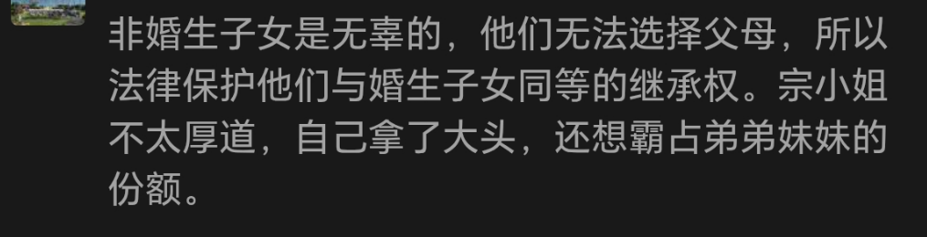 他們説私生子也是無辜的,他們也不是為了當私生子而出生的啊,既然法律規定他們可以拿,那麼宗馥莉憑什麼搶佔他們的部分呢?
