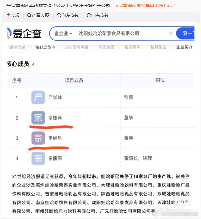 新聞提到,宗繼昌、宗婕莉擔任董事的多家娃哈哈子公司,在今年以來被關閉。