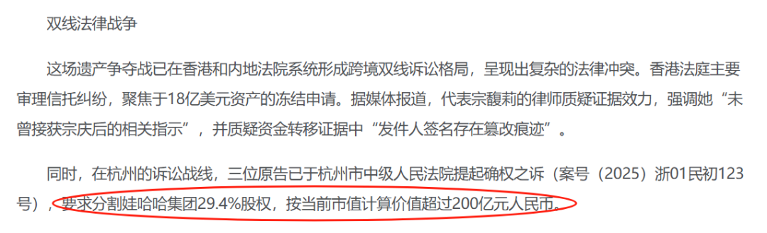 之前報道里説,私生子主張的這個信託賬户的主要來源其實是娃哈哈的分紅。
