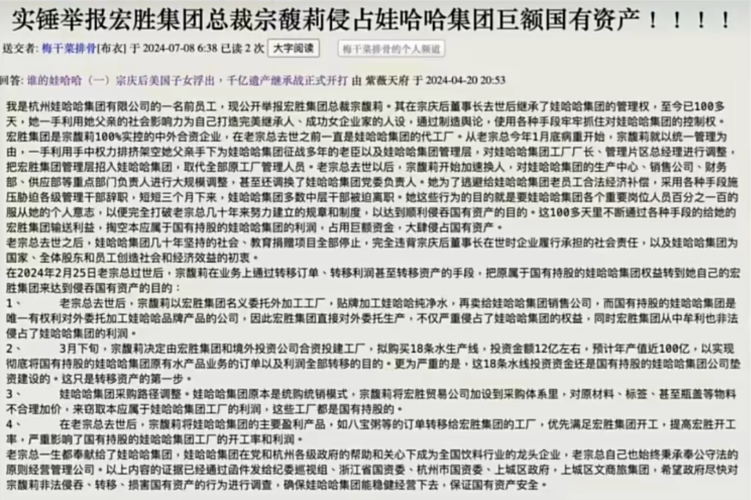 而去年宗馥莉剛剛接手娃哈哈的時候,就有老員工出來舉報她侵佔鉅額國有資產。