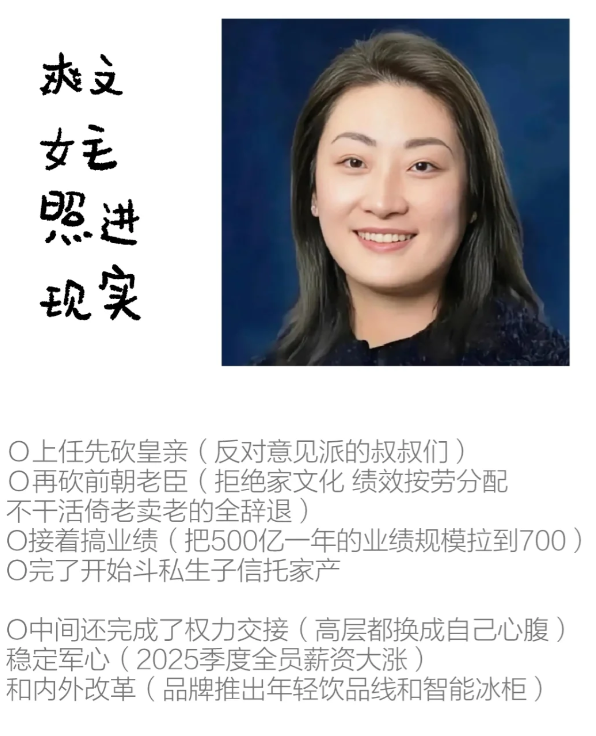 又聯繫她在繼承公司後,進行了一系列大刀闊斧的改革行為,包括修改員工績效模式。