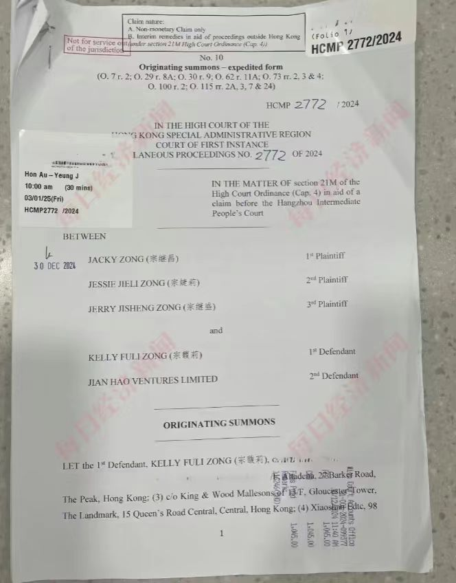 私生子們説,宗慶後在滙豐銀行給他們留下了一筆信託資產,而宗馥莉擅自轉移了110萬美元,要求凍結、退回,以及賠償。