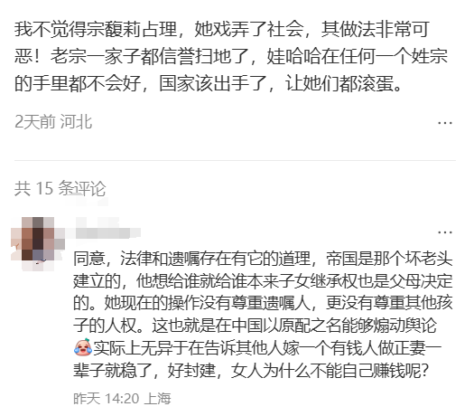 有些人可能是看豪門宮斗的故事看多了,就在這裏想象豪門的潛規則,説人家傳承家產都有規矩的,沒見過搞這麼難看,讓偏房一點便宜都撈不到,還要反過來打官司的。
