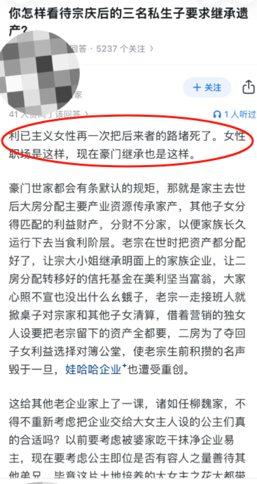 説宗馥莉這麼一搞,以後都沒有豪門敢把家主之位傳給女性了,因為她們“不懂規矩”,會把家族鬧散,還説她這是“利己主義女性”。