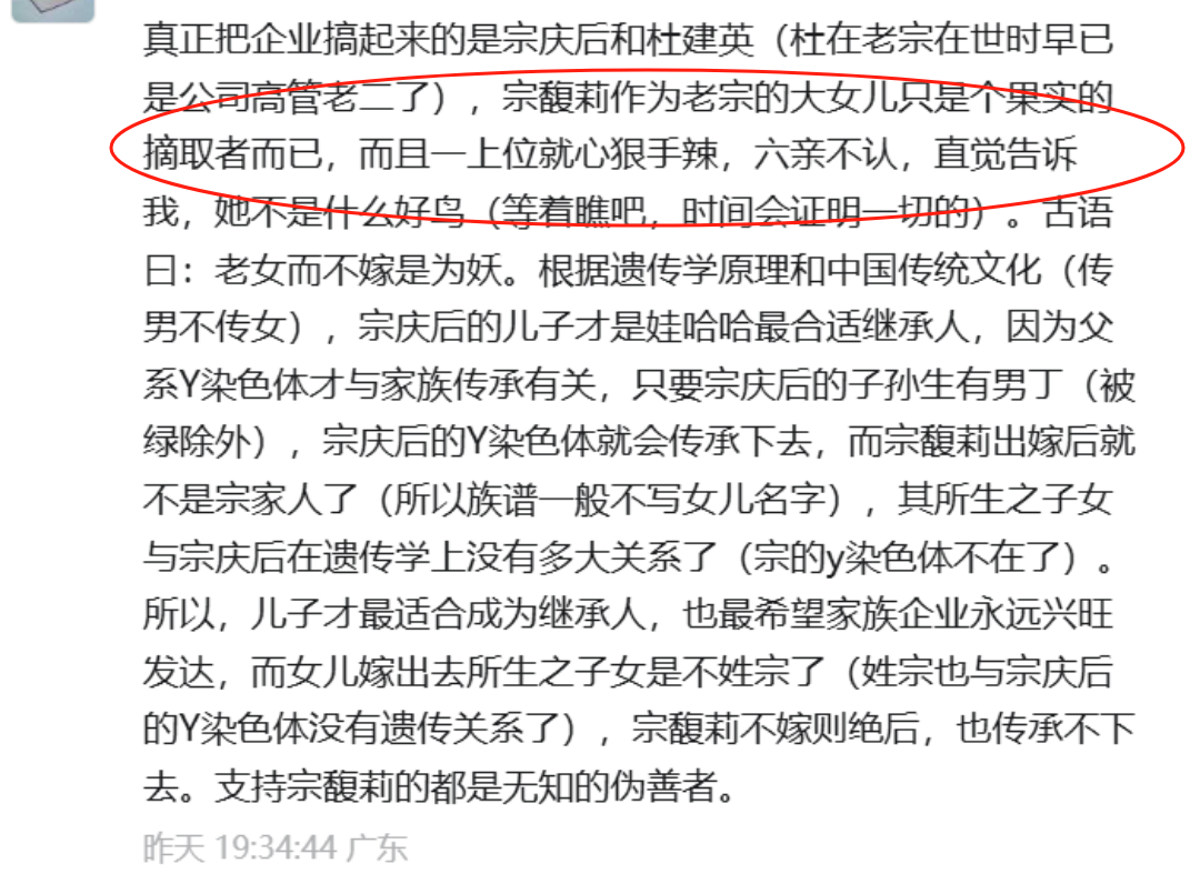 還有人説,不管私生子多壞,既然宗慶後答應了那就應該做到,因為那是他對自己的財產分配是有決定權的,宗馥莉沒權利修改。