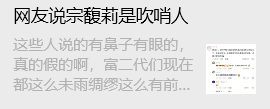 還有人管宗馥莉叫“吹哨人”,説朋友圈的富二代們看了這事以後都飛回家查家產了。