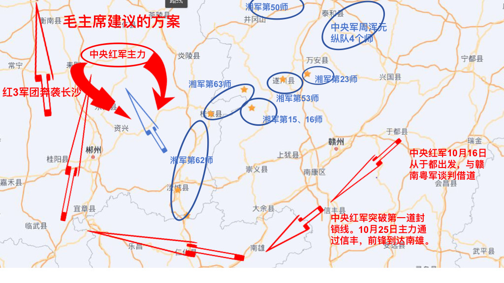 2、這個打法很像前三次反圍剿。當時中央紅軍只有3萬多人,第一、二、三次圍剿蘇區的敵軍分別有10、20、30多萬人,也是從西向東擺出長蛇陣形成對中央蘇區的包圍圈。毛主席指揮紅軍,每次都是集中兵力先殲滅從最西邊富田堡壘中出來的敵人,然後從西向東橫掃過去,“七百里驅十五日,橫掃千軍如卷席”!痛快淋漓地打破蔣軍的圍剿。這一次中央紅軍有8萬多人,面對的湘軍和周渾元縱隊不過10萬多人,按毛主席建議的打法,可以説是勝劵在握。不同的是,前三次反圍剿,紅軍主力是在內線(根據地內部)作戰,而這次毛主席的建議是主力跳到外線作戰。因此,這還是毛澤東軍事思想的一次重大發展。