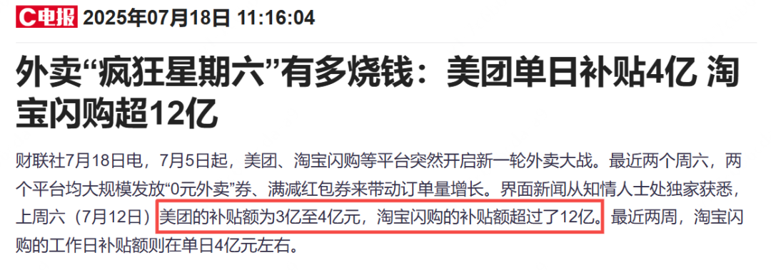 據界面新聞報道,上週六(7月12日)美團的補貼額為3億至4億元,約為淘寶閃購的四分之一,單量卻達到1.5億。