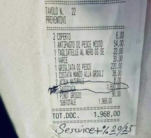 貝瑪從服務人員手上接過賬單的第一眼,就發現了Sassicaia紅酒價格從菜單標價500歐元翻了三倍,變成了1500歐元。
