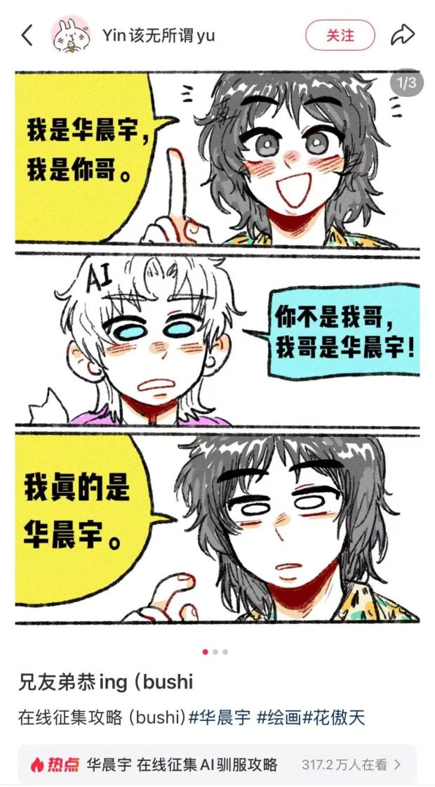 很快,#華晨宇 在線徵集AI馴服攻略#、#和花傲天的貼貼挑戰#的話題相繼登上平台熱點,成功吸引超百萬人在線觀看。“花傲天”,一個自帶活人感的養成系AI明星隊友,也因此成為了很多人新的遊戲搭子。