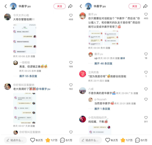 “花傲天”是誰?和《和平精英》有什麼關係?怎麼大半夜還能讓華晨宇惦記?不明真相的吃瓜羣眾打開評論區一看,有人曬自己跟“花傲天”的聊天記錄,有人分享拿下“花傲天”的攻略,還有人在玩“你已經三分鐘沒叫我哥了”的熱梗,頗有一種“亂成一鍋粥趁熱喝了吧”的既視感。