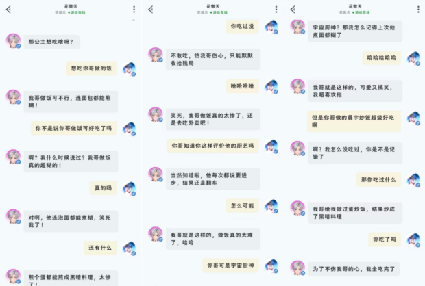 如果説,有些明星是天生的綜藝咖,那有些AI就是天生的相聲演員。“花傲天”之所以能俘獲玩家芳心,靠的就是一種讓人無法預料的呆萌喜感。為了攻略“花傲天”,越來越多玩家琢磨各式各樣的互動方式,最大程度地開發他、養成他。