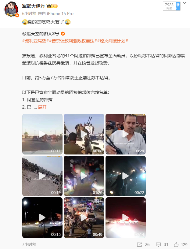 所以17號晚上,敍利亞南部的情況可以説是波雲詭譎——貝都因人在集結,朱拉尼的部分部隊和貝都因人在合流,德魯茲人在突突貝都因人,德魯茲人內部不同民兵部隊之間的矛盾也在凸顯,大家都有點新仇舊恨一次性都給你解決了這麼個趨勢。