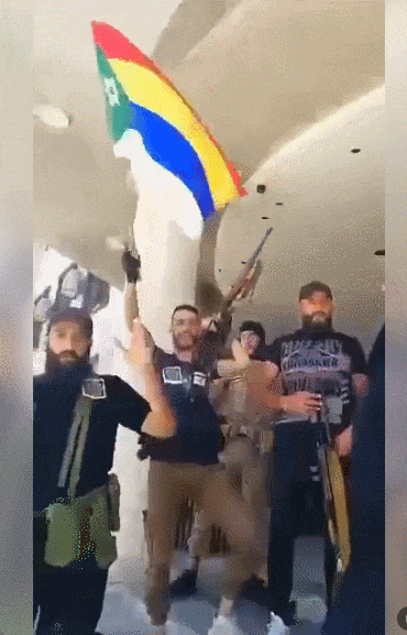 ▲德魯茲********人武裝人員在蘇韋達政府大樓門口慶祝,他拿的德魯茲旗幟上有一顆猶太人六芒星****************