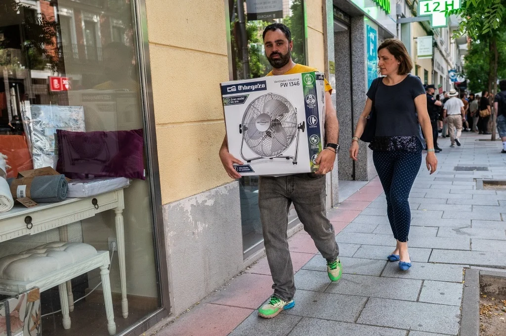 當地時間2025年6月2日,西班牙馬德里,一名男子在高温天氣中攜帶電風扇。