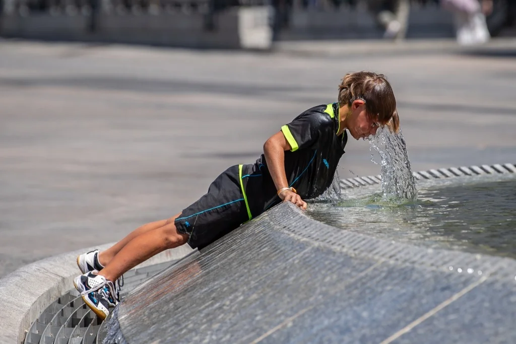 當地時間2025年7月17日,西班牙馬德里,一名兒童在太陽門廣場的噴泉中消暑。