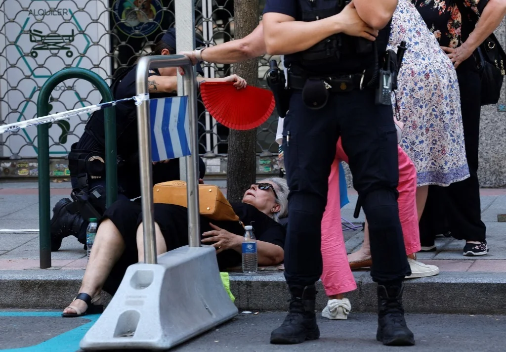 當地時間2025年7月5日,西班牙馬德里,一名女子在街上因中暑暈倒,警察為她扇風降温。