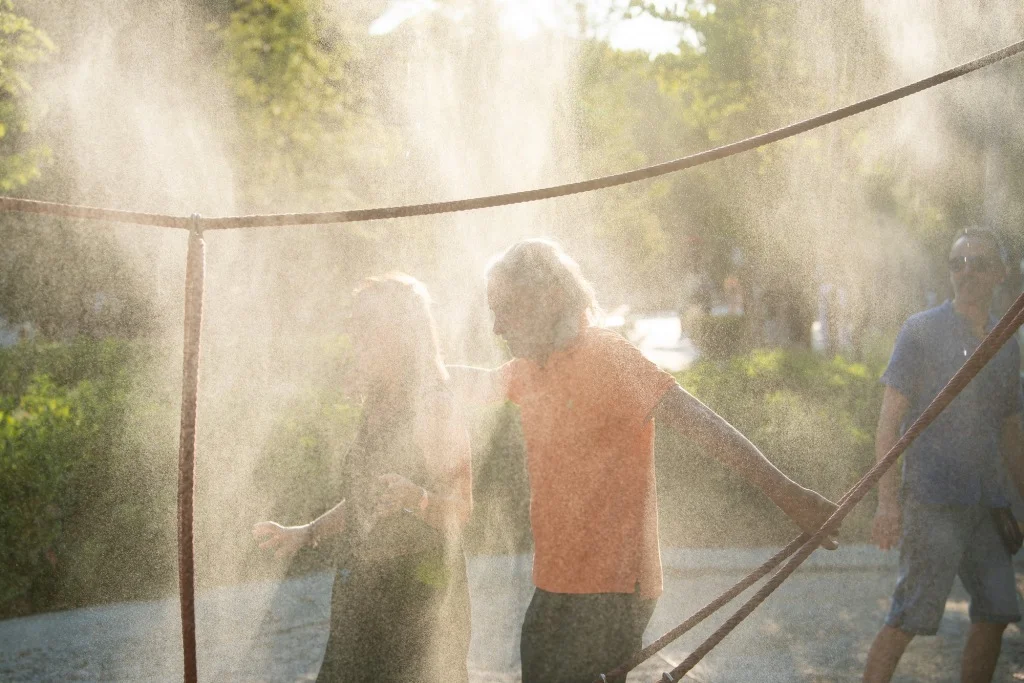 當地時間2025年7月16日,西班牙馬德里,西班牙廣場,人們用噴水裝置降温。