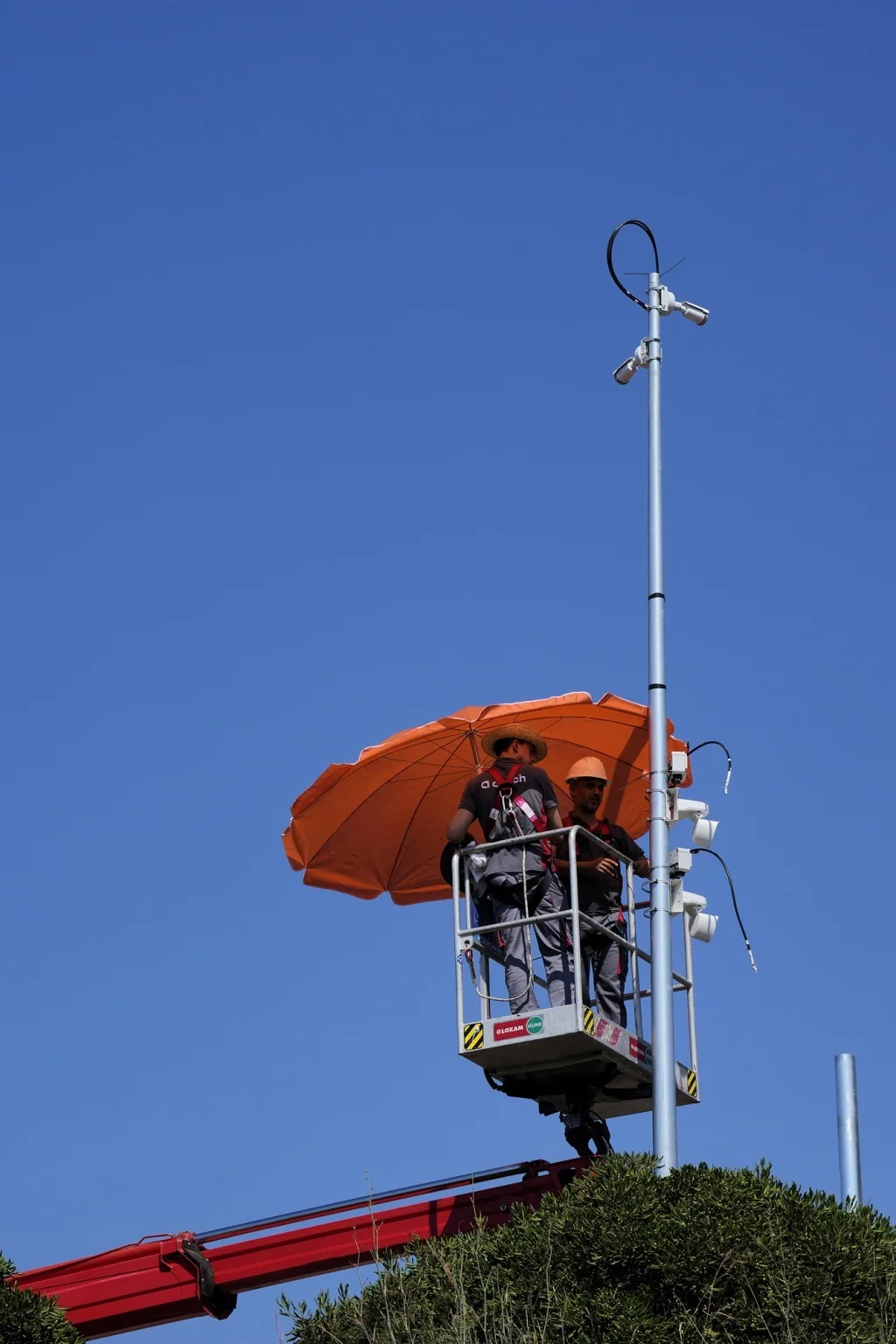 當地時間2025年6月30日,西班牙東北部巴塞羅那,工人在起重機上使用遮陽傘。