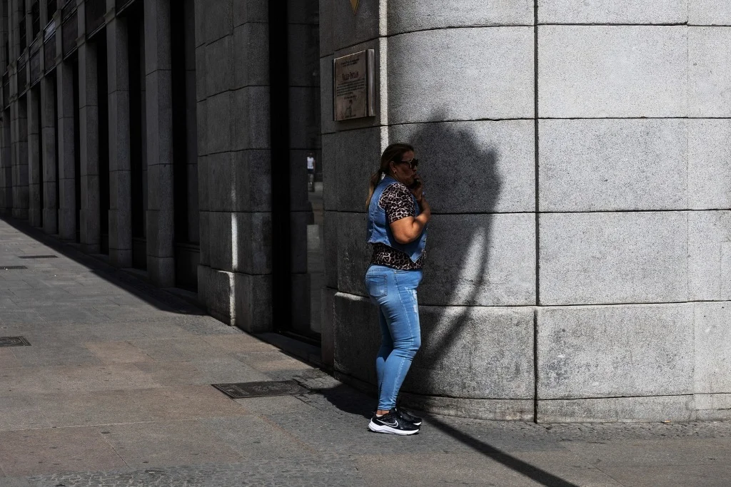 當地時間2025年6月20日,西班牙馬德里,一名行人在高温下於陰涼處打電話。