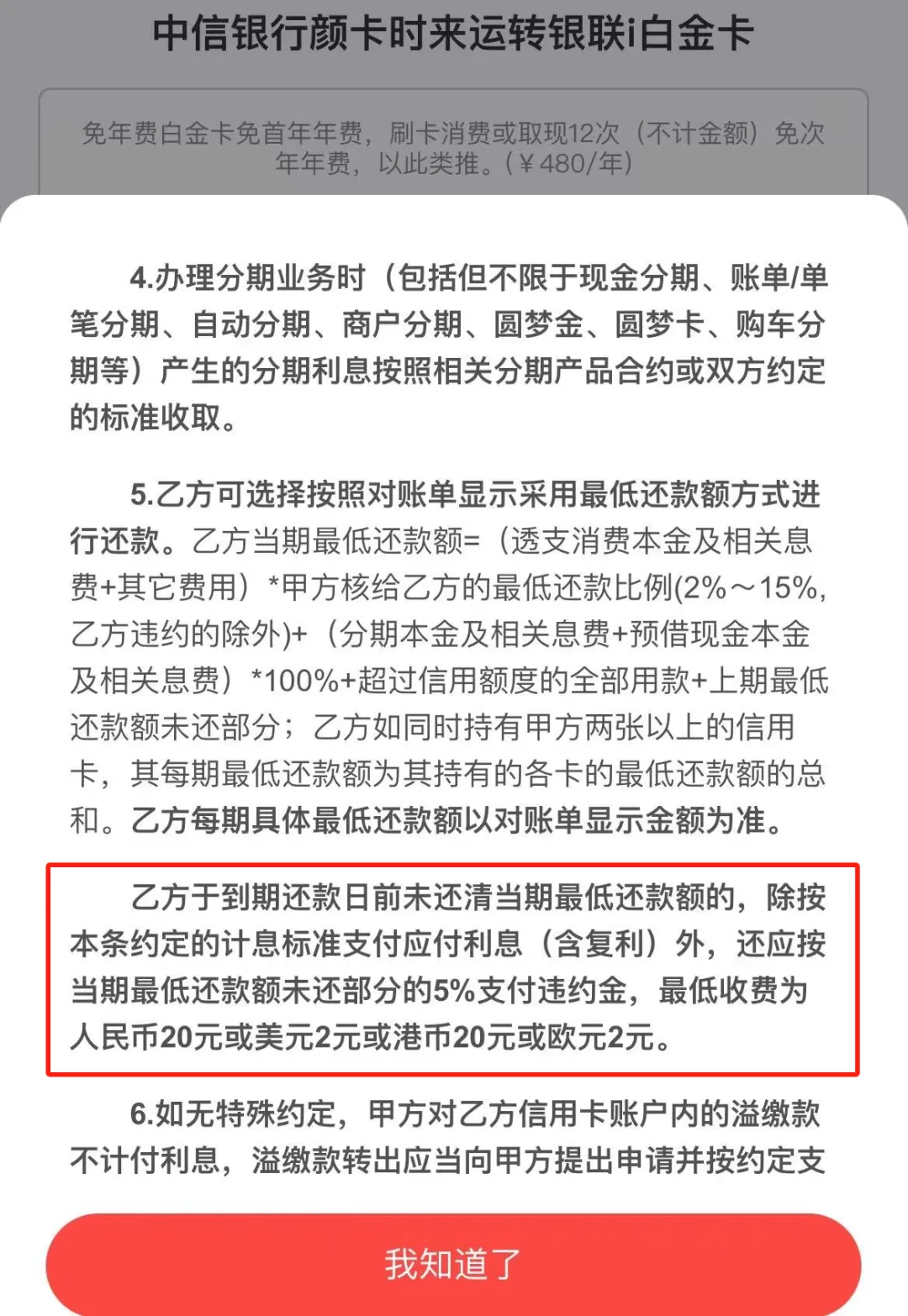 違約金方面,中信銀行信用卡設置了較高的違約金成本。以最低還款額方式為例,持卡人於到期還款日前未還清當期最低還款額的,除按照約定的計息標準支付應付利息(含複利)外,還應按當期最低還款額未還部分的5%支付違約金。