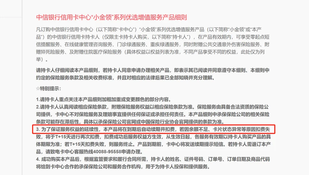 在增值服務產品細則中,中信銀行信用卡列出了特別提示,其中有一項為“為了保證服務權益的延續性,本產品將在服務到期後自動續期並扣費……若持卡人需退訂本產品,請致電卡中心客服熱線申請辦理”。增值服務自動續期的邏輯,也為增值業務收入增加了可能。