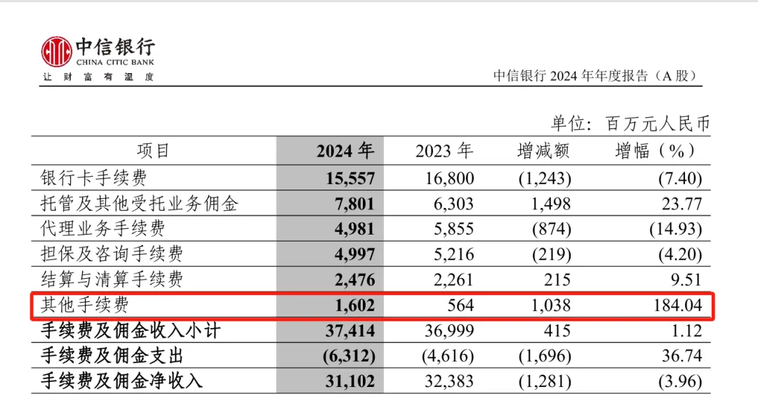 值得注意的是,中信銀行在財報中提及的六項手續費及佣金科目,涉及銀行卡手續費、託管及其他受託業務佣金、代理業務手續費、擔保及諮詢手續費、結算與清算手續費、其他手續費,其中有一項“其他手續費”收入大幅增加。