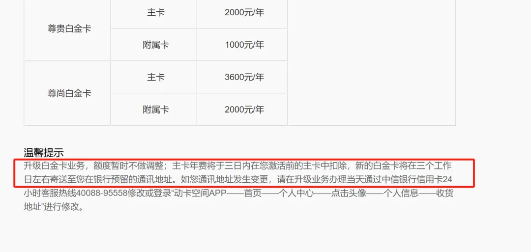 在年費產品卡升級服務中,中信銀行信用卡表示,升級白金卡業務,額度暫時不做調整;主卡年費將於三日內在持卡人激活前的主卡中扣除。