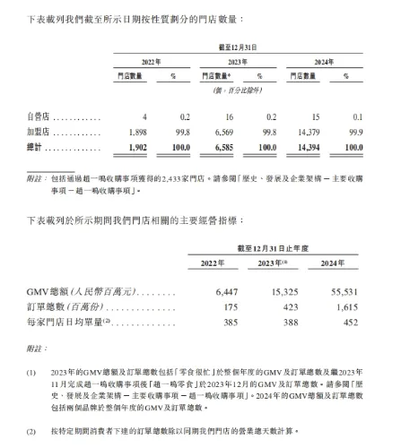 據招股書顯示,2022年至2024年年底門店總數分別為1902家、6585家、14394家,2024年對比2022年,增長6.6倍,單店日均單量僅從385單上漲17.4%至452單,營收的這一爆發式增長主要由於訂單總數的增長,而訂單總數的增長主要依賴門店數量的擴張,單店運營能力的提升相對較低。