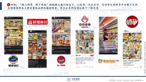 據《中國零食量販行業藍皮書》中顯示,量販零食在2017年之後的五年內實現了爆發式增長,預計到2027年將達近1400億元規模,中國零食量販“好價、好物、好逛、好買”的特點,符合消費者近幾年經濟承壓追求高質價比的新需求。同時,在“線上種草、線下體驗”購物模式盛行的當下,小紅書、大眾點評、抖音等頭部種草平台不乏網友傾情推薦各大零食量販品牌的爆款零食,吸引眾多網友前往線下一探究竟。