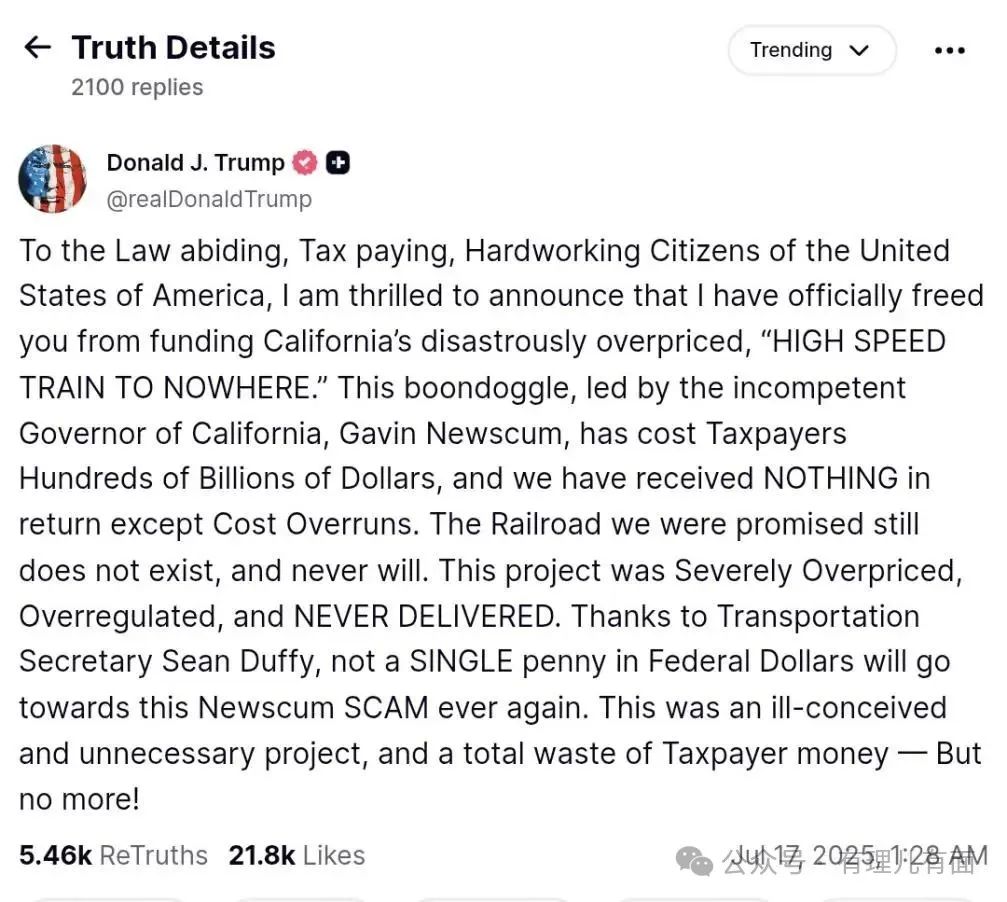 7月16日,特朗普在社交媒體上正式宣佈終止對加州高鐵項目的40億美元聯邦撥款,並將其稱為“災難性、嚴重超支的、通往虛無的高鐵”。