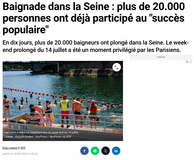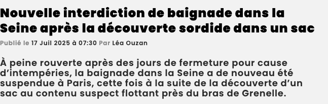 然而,上週7月11日星期五之後,此熱情驟降。一開始在巴黎十五區游泳區因惡劣天氣關閉了,後來勉強重新開放。然鵝,這又再次關閉。
